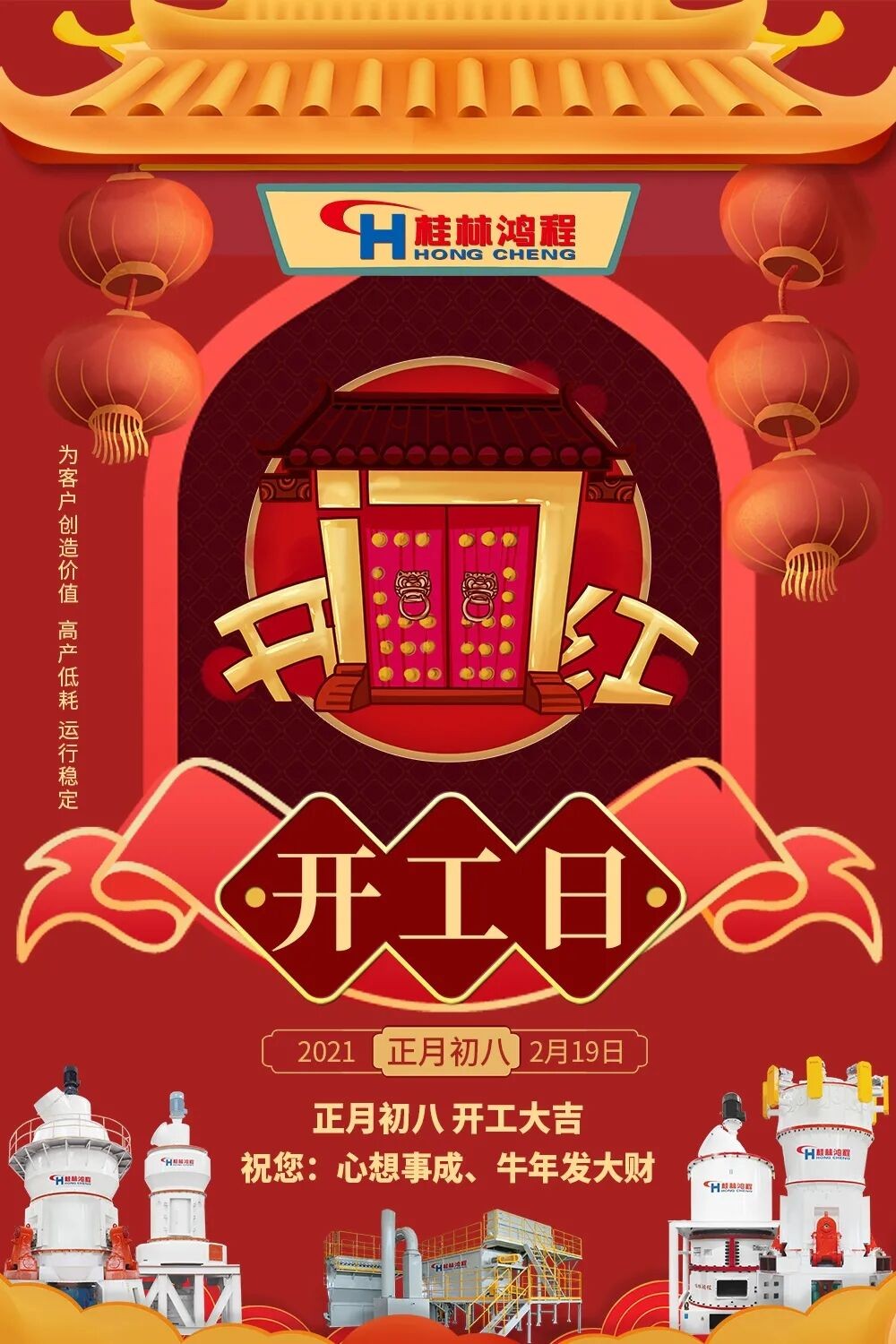 今天,桂林鴻程已全面開工,鴻程人將繼續以飽滿的精神面貌為您提供全方位服務。2021年,我們將繼續高歌猛進,齊創牛績,共創輝煌。
